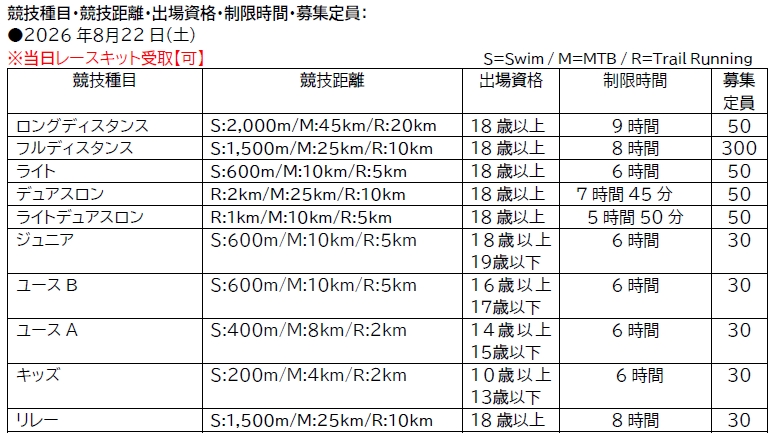 10歳から参加できる「キッズ」(スイム200m/MTB4km/ラン2km)から、制限時間9時間の「ロングディスタンス」(スイム2km/MTB60km/ラン20km)まで種目が充実。