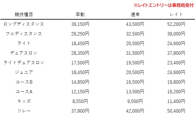 ・気象状況、天災・事件・事故・疫病等により大会開催のコース変更・内容縮小・中止等になった場合でも参加費の返金は致しません。また入金手続き完了後は如何なる理由であっても申し込みのキャンセル、参加費の返金はできませんのでご了承ください。なお選手の代替出場も認めておりません。参加者は大会規定のルールに則って安全に競技を行います。