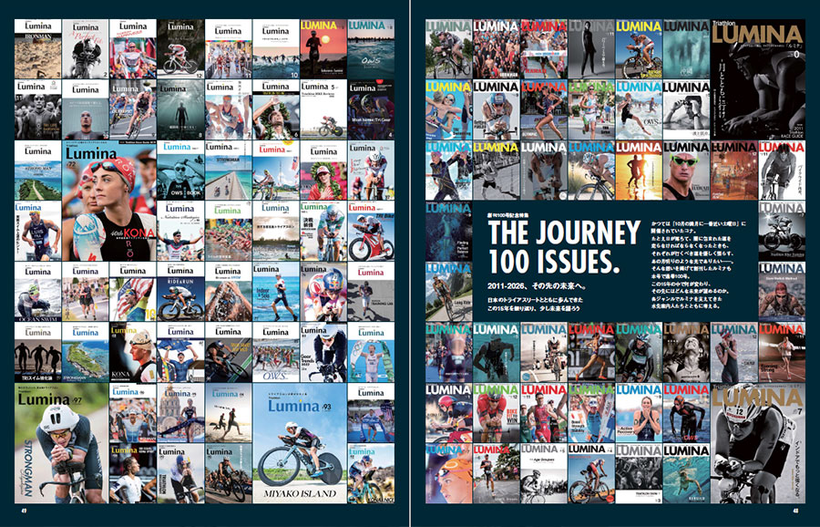 2026年からアイアンマン世界選手権は、再び男女同時開催へ。女子単独開催として華やかにKONAを彩った2025年大会は、男子に続き女子もノルウェーの新星、ソールバイ・ロブセットが制しました。波乱のレース展開を選手のコメントと共に振り返ります。そして、Luminaは今号で通算100号を迎えました。創刊から16年、トレーニング、バイク、レースの各ジャンルで誌面を支えてくださった方々に、その歴史を語っていただきました。懐かしい表紙写真も必見です。さらに別冊付録「レースガイド2026」付き! エントリーが始まっている大会も含め、新たなレースとの出会いを楽しみながら、今季の計画にお役立てください。
